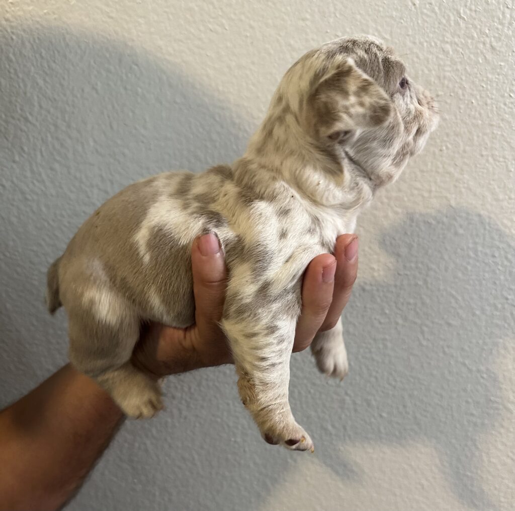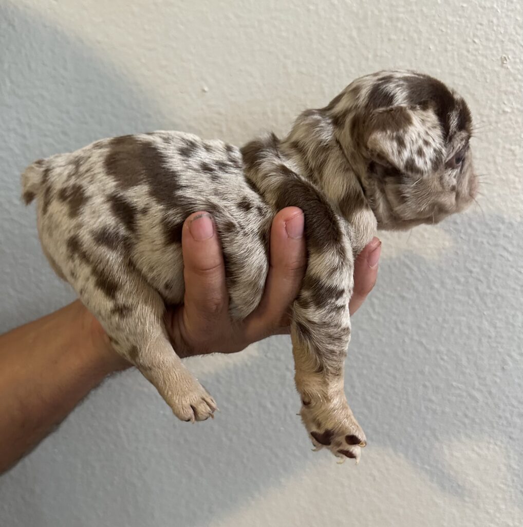 Meet this gorgeous compact female French Bulldog with a striking merle coat that makes her truly one of a kind. Her petite, muscular build is perfectly proportioned, and her unique patterning turns heads wherever she goes. Sweet-natured, confident, and full of personality, she’s the perfect mix of elegance and attitude—a standout addition to any home or breeding program.