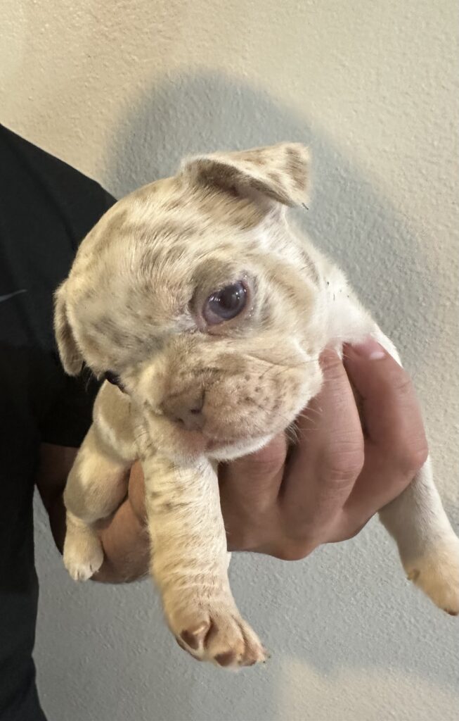 This eye-catching female French Bulldog showcases a stunning merle coat that sets her apart with its unique, marbled pattern and vibrant coloring. Her playful personality, compact frame, and gentle nature make her as sweet as she is striking. Whether you’re looking for a loyal companion or a standout addition to your breeding program, she brings rare beauty and undeniable charm.